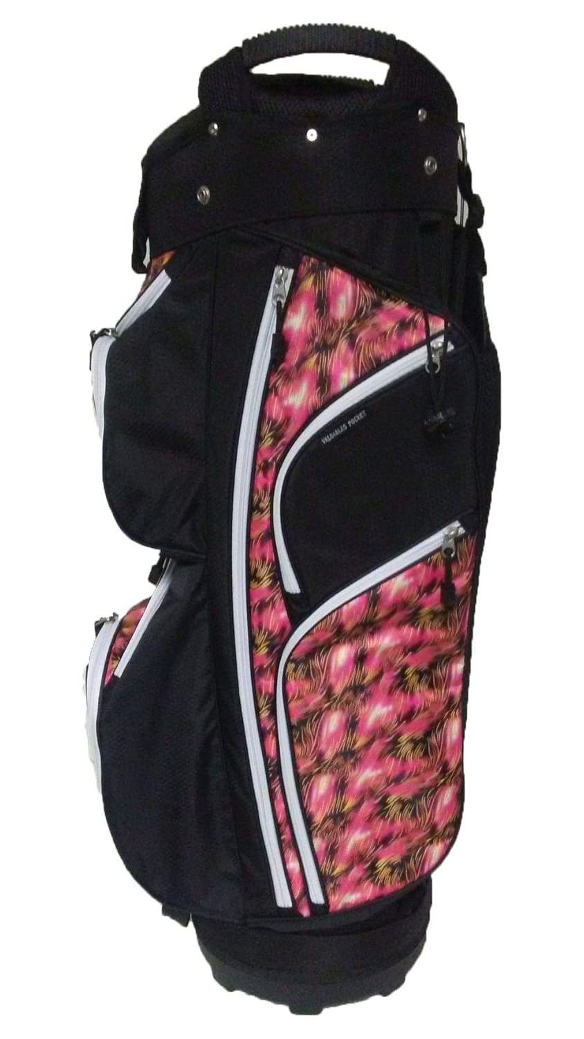 10インチ、14ウェイトップ、フルレングスの仕切り、9つのジッパー付きポケット、貴重品ポーチ、クーラーポケット、パッド入りストラップ、グローブホルダー、ボールホルダー、傘ホルダー、レインフード付き。
