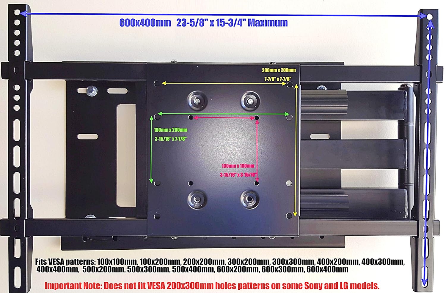このマウントは、現在販売されているほとんどの32~70インチのテレビに適合します。 3-15/16インチ X 3-15/16インチまたは幅23-5/8インチ x 15- 3/4インチ (テレビ用語でVESA 100x100mm - 600x400mm)の取り付け穴があるテレビに適合します。 特にVESA 100X100mm、200X100mm、200X200mm、300×200mm、300×300mm、400×200mm、400×300mm、400×400mm、500×200mm、500×300mm、500×400mm、600×200mm、600×400mm。 関節式アームで、このマウントは3インチ(壁から壁まで)に収まり、スペースを節約し、壁から40インチまで伸ばします。 傾斜と回転機能。