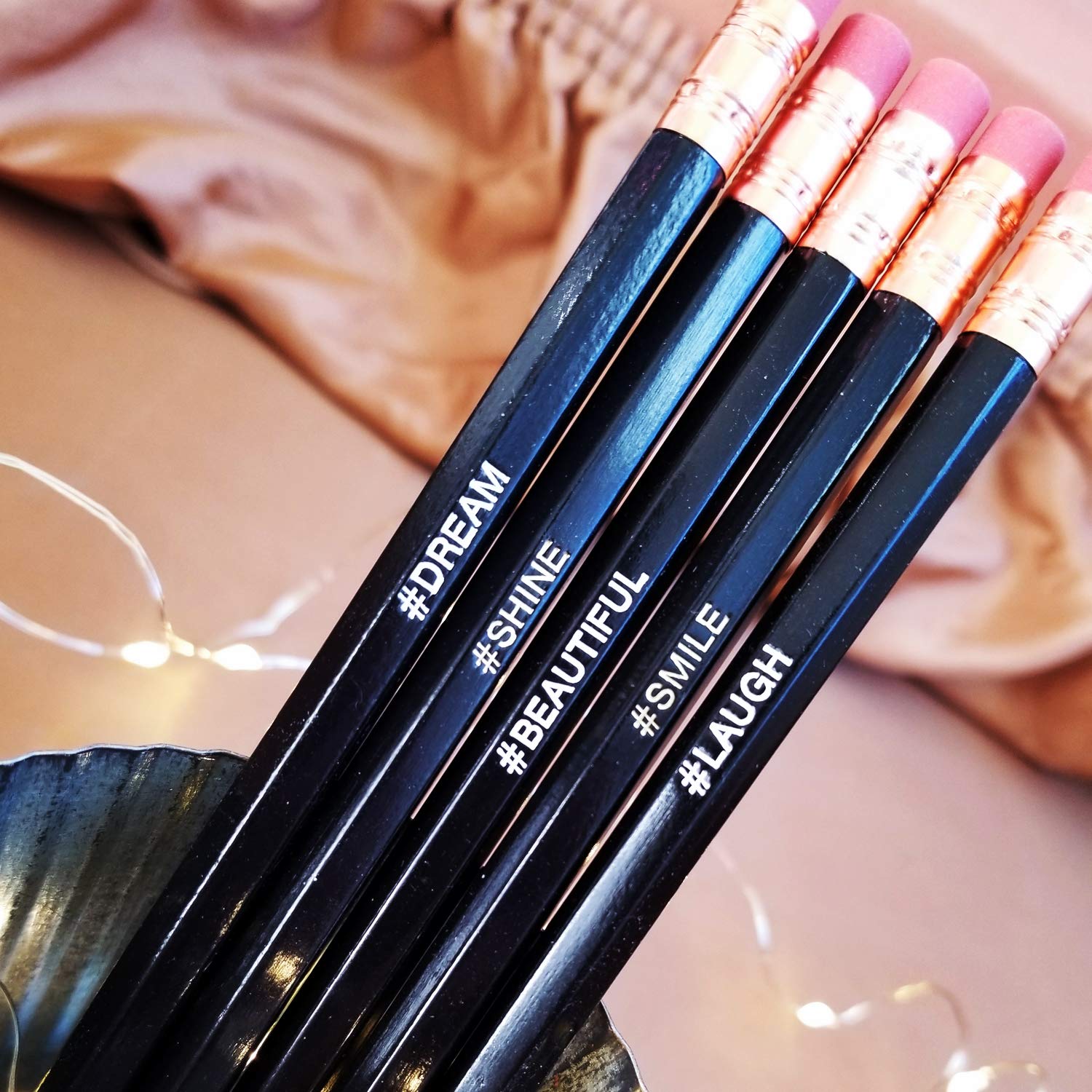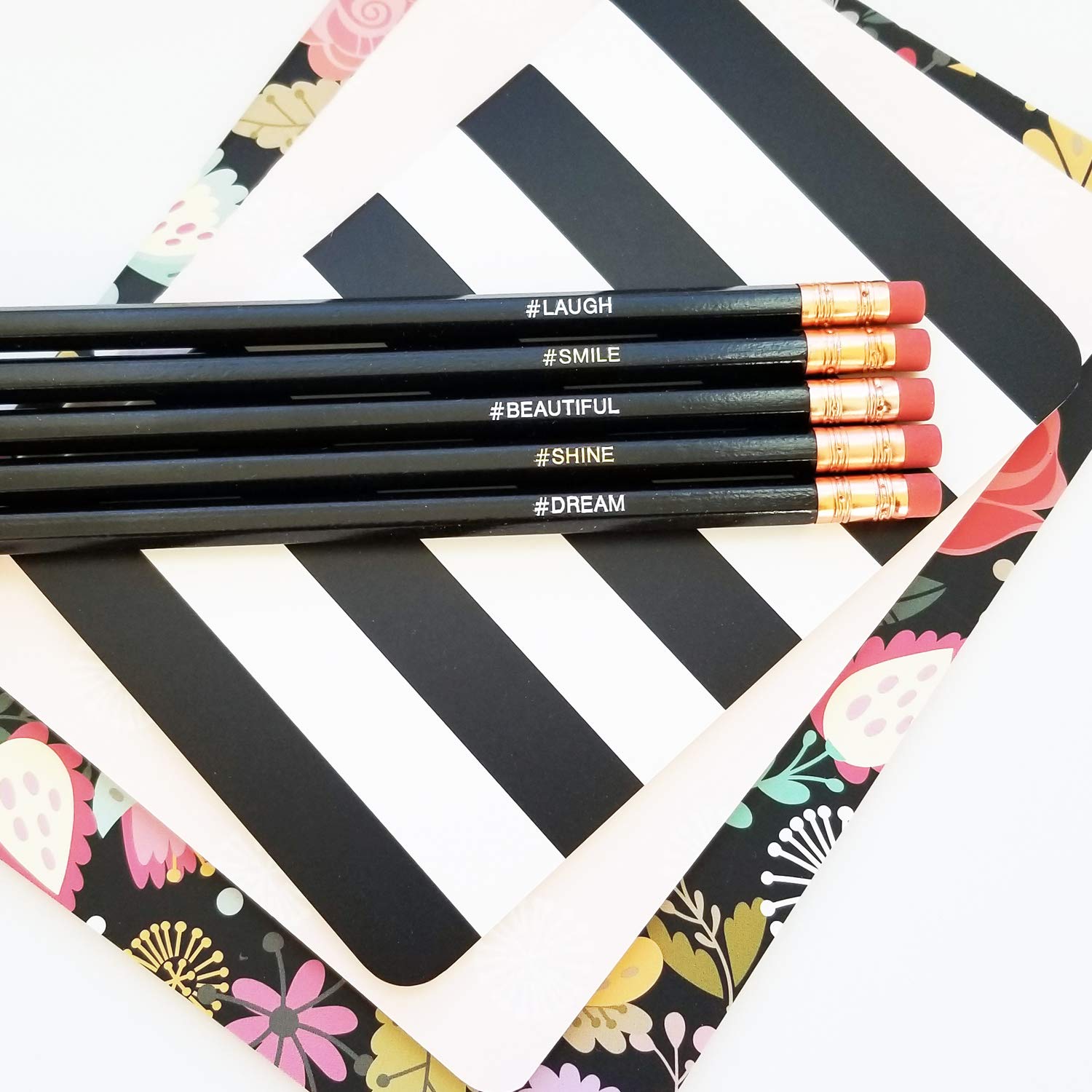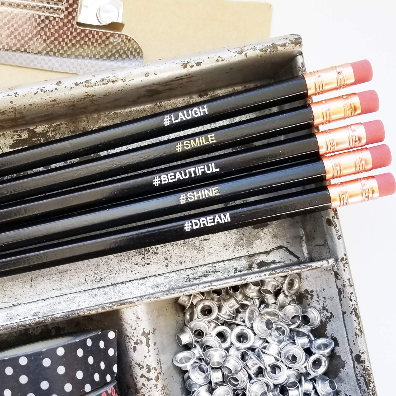 # ラフ、# 美しい、# DREAM鉛筆は白い文字が入っています。このNo.2鉛筆5本セットは素晴らしいです。 削られていない鉛筆には、楽しいハッシュタグの言葉が書かれており、励ましとインスピレーションを与えます。 この鉛筆は素晴らしいユニークなギフトになります。 # LAUGH # SMILE # BEAUTIFUL # SHINE # DREAM