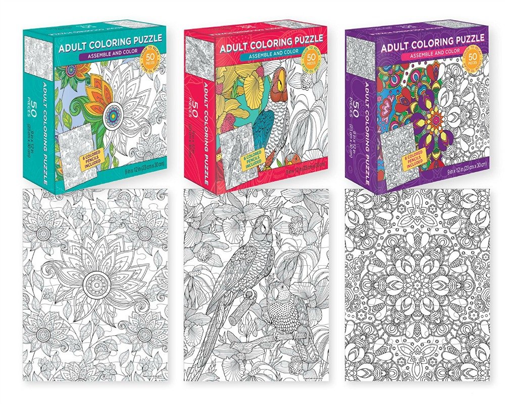 3つの異なる大人用塗り絵パズルは大人向けで、より詳細で複雑なデザインがありますが、子供たちもこれらの楽しみを見つけることができます。 各パズルは、9インチ×12インチ(23cm×30cm)のサイズです。