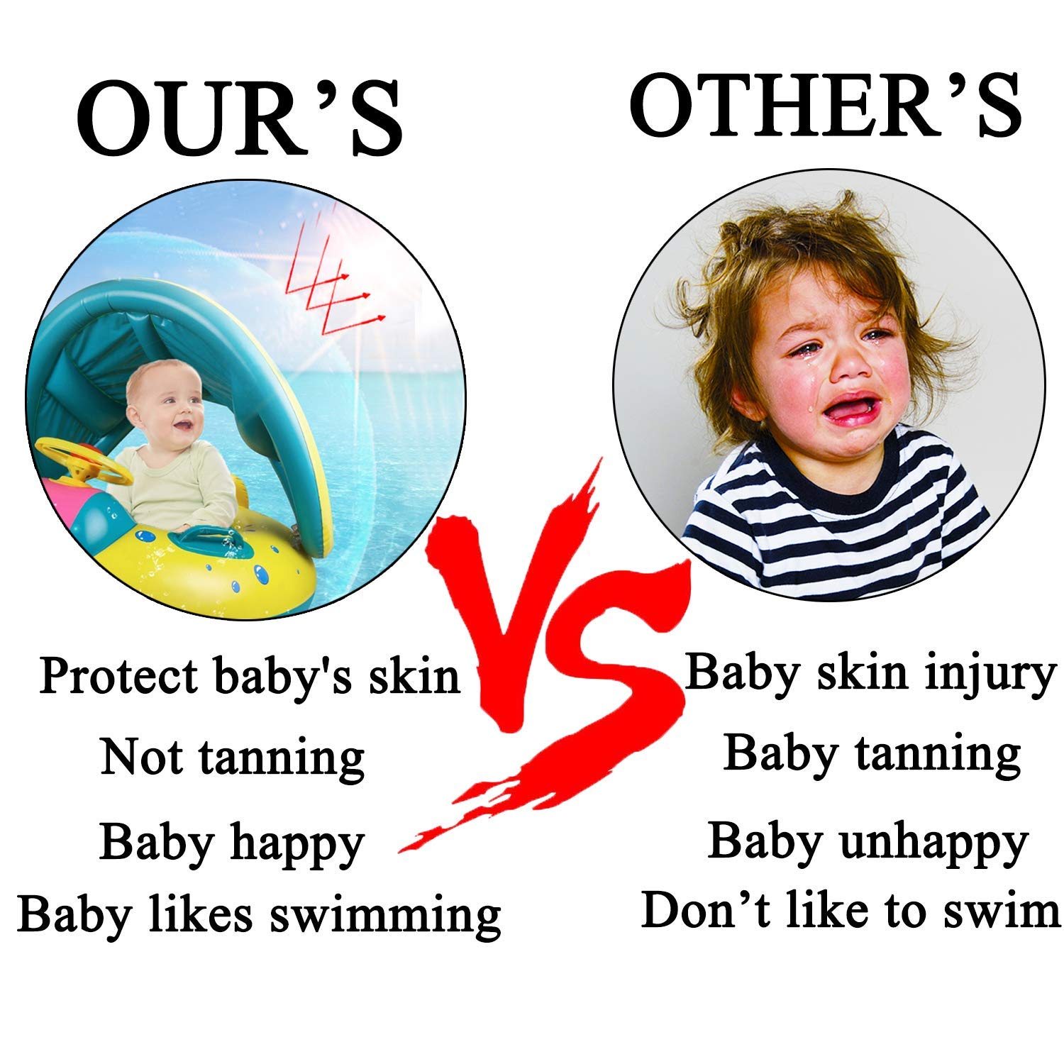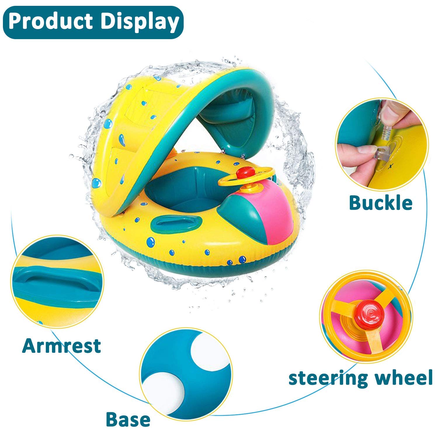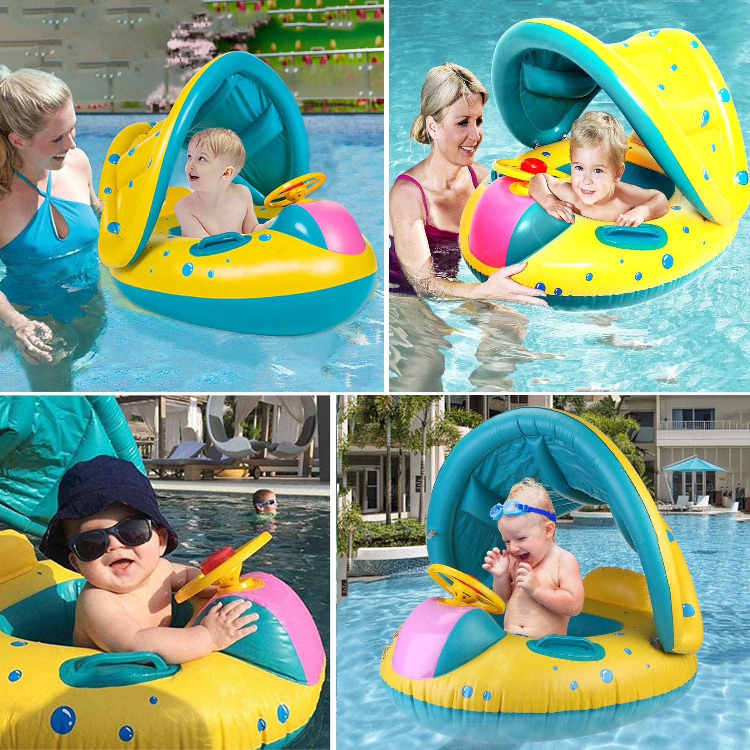 - [大きなサンシェードキャノピー] - 調節?取り外し可能なサンシェードキャノピーは、赤ちゃんを太陽から守ります。赤ちゃんの顔やボディにサンスクリーンクリームを使用する必要はありません。ホットプールパーティーでは、赤ちゃん用のサンシェードキャノピーを使用できます。