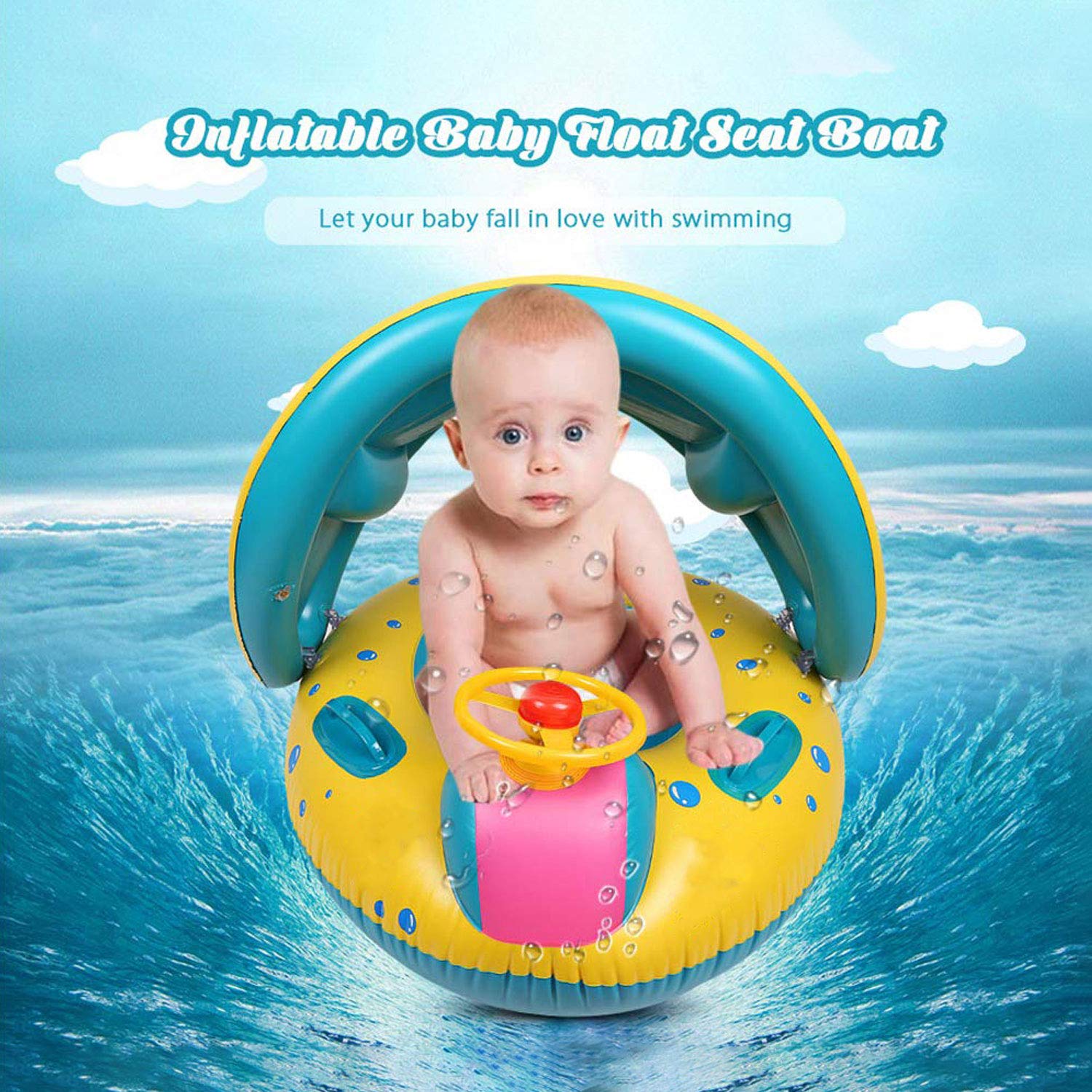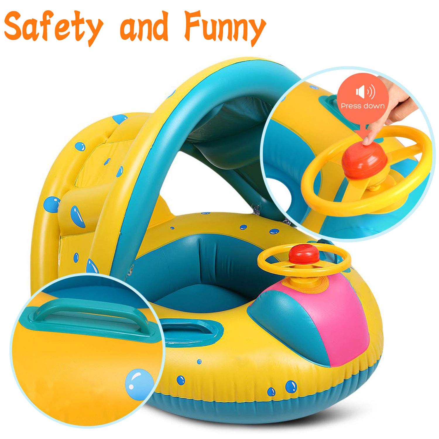 [注意点]-1.プールパーティーで赤ちゃんと一緒に行ってください。 2. -- [赤ちゃん用に設計] -UPF50+保護。 ファンバーグは最高の水泳ベビーフロートを準備しています。取り外し可能なキャノピーで太陽の有害な光線から赤ちゃんを保護します。ハンドルにホーンがついており、実際にビープ音がします。 あなたの小さな船長がやって来ました。